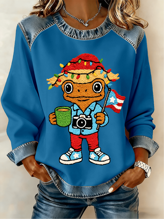 Women's Puerto Rico Christmas Print Denim Patchwork Top