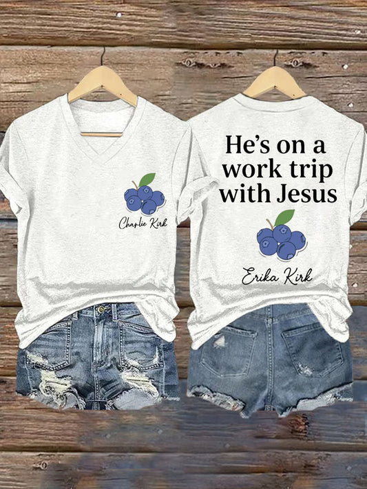 Women's He's On A Work Trip With Jesus Faith Based Inspired By Erika Kirk, Pray For Charlie Kirk V-Neck Tee